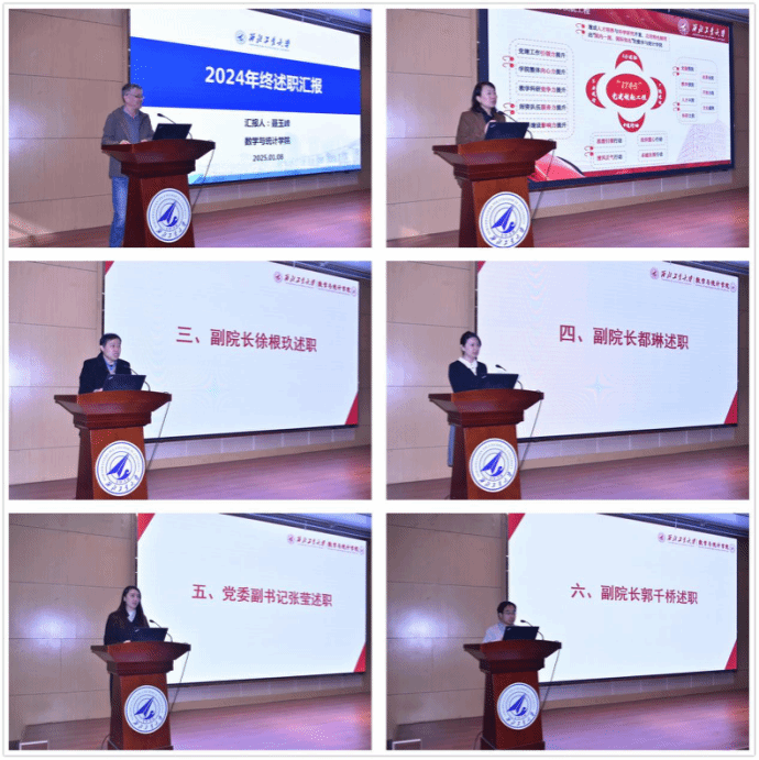 领导班子全体成员聂玉峰、王莉、徐根玖、都琳、张莹、郭千桥依次从个人思想情况、主要工作思路及业绩、存在的问题以及下一步工作计划三个方面做工作述职报告。同时,领导班子全体成员在述职述责述廉中按照学校有关要求进行了报告,接受全体教职工的评议和监督。全体教职工对学院领导班子成员进行测评投票。