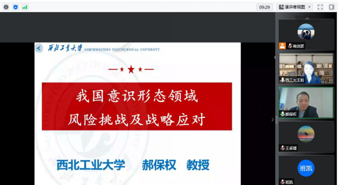 为进一步加强学院师德师风建设,提高意识形态阵地建设和管理能力,强化教职工意识形态防范意识,压紧压实意识形态工作,团结凝聚广大教师以更加昂扬向上的精神风貌和立德树人的扎实行动迎接党的二十大胜利召开,按照学院《关于开展 *成人片 2022年“师德师风建设月”活动的通知》要求,9月29日通过线上会议, *成人片 邀请陕西省政党治理与意识形态安全中心主任、学校马克思主义学院教授郝保权老师做题为《我国意识形态领域的风险挑战及战略应对》的专题报告,学院全体教职工参加了此次报告会,报告会由党委书记王莉主持。