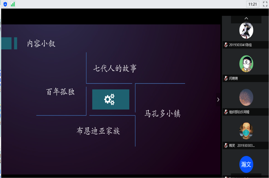 刘海坤,熊焰森同学共同为大家分享马尔克斯的《百年孤独》。《百年孤独》这本书被誉为“再现拉丁美洲历史社会图景的鸿篇巨著”,描写了布恩迪亚家族七代人的传奇故事,以及加勒比海沿岸小镇马孔多的百年兴衰。这本书时间跨度长,涉及历史区域广,且融入了神话传说、民间故事、宗教典故等神秘因素,糅合了现实与虚幻。在与大家的分享中,两位同学结合自己的阅读历程将自己的感受娓娓道来。