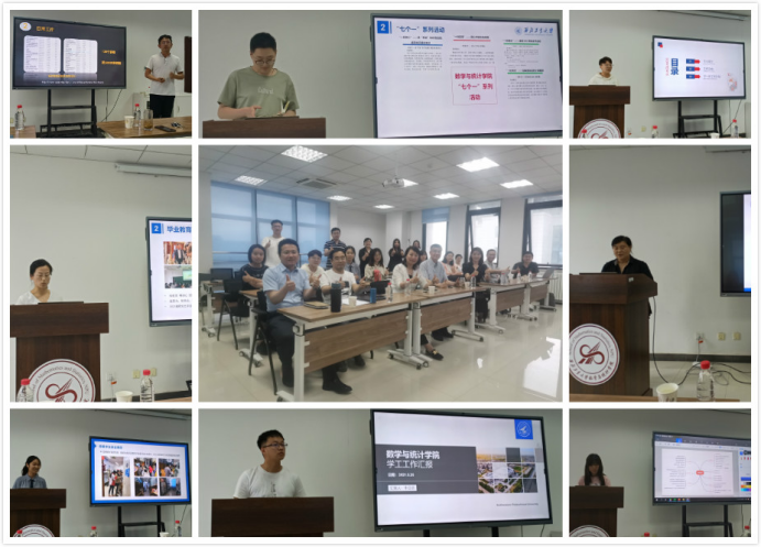 15位专兼职辅导员依次汇报了自己的工作内容。专职辅导员主要从自身所带年级入手,一方面主要从学生的基本数据、思想状况、学风建设、安全稳定以及日常常规工作展开,展示了年级数据汇总,提出了存在的问题以及可实施方案。另一方面主要讲述了自身的专项工作,从学习支持辅导中心、创新创业以及各类专项活动,重点了解学生的学习、生活状况。组建心理辅导站,排解学生压力,进行新生适应访谈以及各类竞赛活动。制定各类学院管理制度,积极进行心理安全工作,确保学生的日常安全稳定。同时在建党百年之际,以特色党建活动为抓手,七个一系列活动为日常工作积极进行组织。下一步工作计划也主要围绕学生日常工作进行,做到善始善终、尽善尽美。