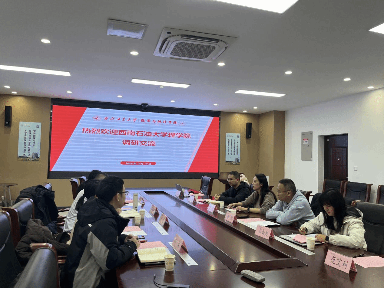 12月10日上午,西南石油大学理学院党委副书记王茂江一行4人来成人片 进行学生工作、数学学科建设等调研交流。院长助理班凯、王晓龙、学生工作办公室全体成员参与本次活动,活动由党委副书记张莹主持。