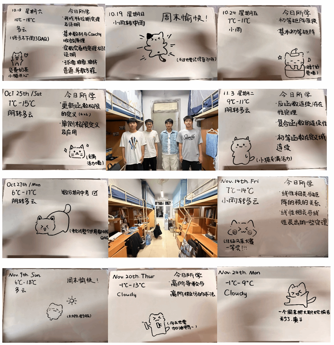 宿舍简介:我们宿舍以自律有序为核心文化,作息规律,早睡早起,兼顾学业精力与互不打扰,营造安稳氛围。秉持互助共进理念,舍友间相互督促、共同进步,聚焦学业成长。以小黑板为载体,梳理数学专业知识点助力巩固学业,搭配超萌小猫黑板画缓解压力,兼顾学习氛围与温情。注重环境整洁,用心打理宿舍,规范摆放物品,兼顾安全与美观。全员精神昂扬、举止得体,展现数学学子自律向上、勤学互助、温暖和睦的宿舍风貌。(图/文:朱利、各参赛宿舍/审核:张莹)