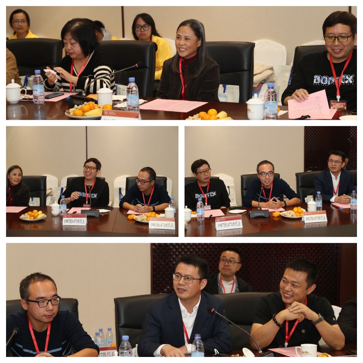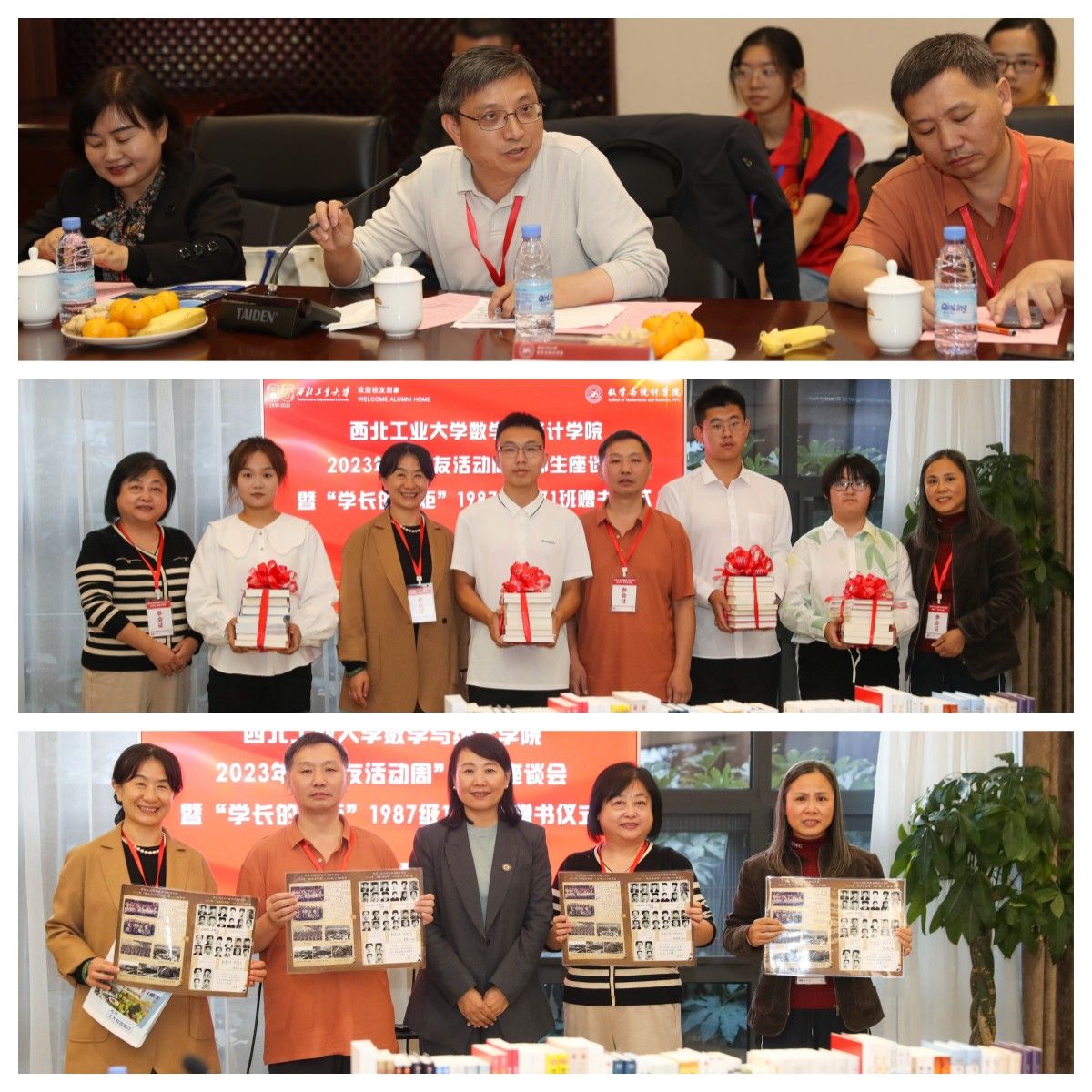 1987级1471班校友代表王永忠在感谢学校、学院悉心栽培的同时,也代表所在班级介绍了本次赠书活动的初衷。110本内容丰富的书籍,每本扉页上学长们的亲笔寄语,不仅希望同学们能静下心来,养成良好的阅读习惯,陶冶情操,而且希望大家能在大学期间能牢记四点嘱托:一是要努力学习,踏实学习;二是要交好朋友,要交有担当责任的朋友;三是要有宽广胸怀,要以真诚善良面对他人;四是不仅要埋头苦干,而且要抬头看路。学院党委书记王莉代表学院向1471班回赠了28份精心设计,印有当年1471班全体同学毕业时个人照片、签名、学院资深教师寄语以及学校部分老照片的塑封画报,瞬间让校友们在惊喜之余,眼角泛出泪水,纷纷表示对学校、学院本次活动的细致服务和周到安排感激万分。