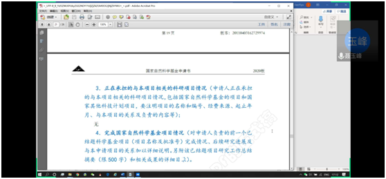 随后,青年教师依次展示青年基金的申报书。专家组成员从代码和关键词选择、研究意义阐述、研究内容和研究方案的撰写、关键科学问题和创新点的提炼,研究基础的介绍等方面对青年教师进行了指导,并从排版格式、经费与预算等方面提出了建议。
