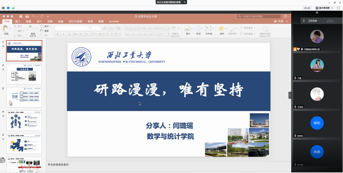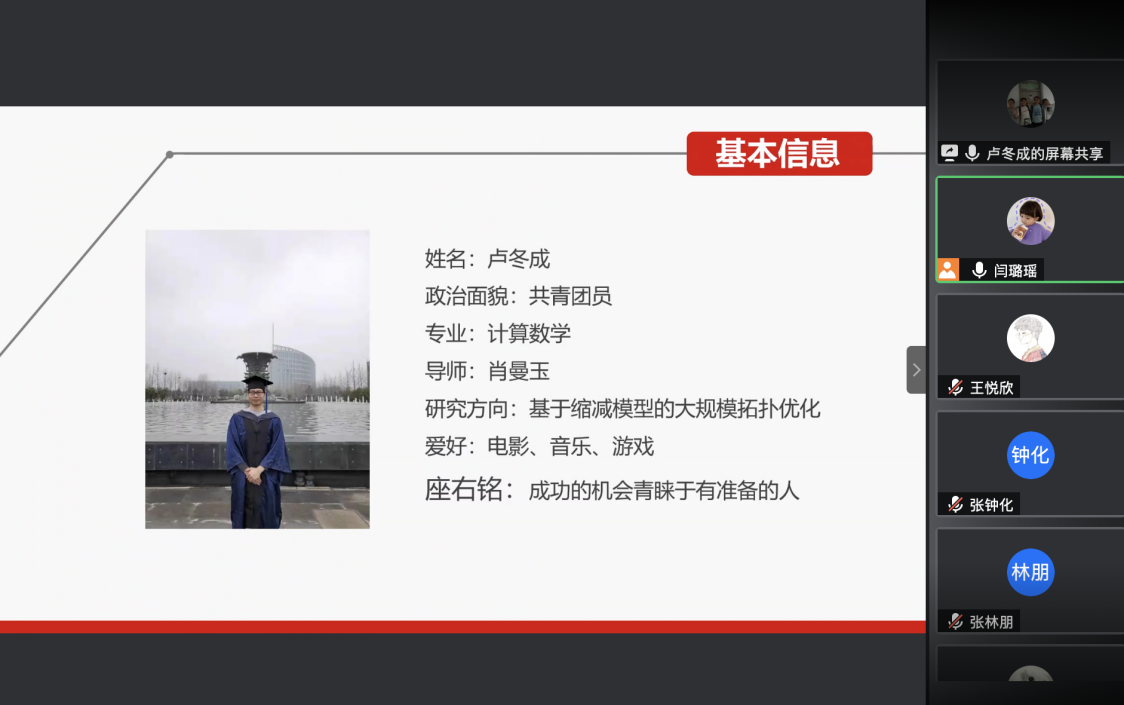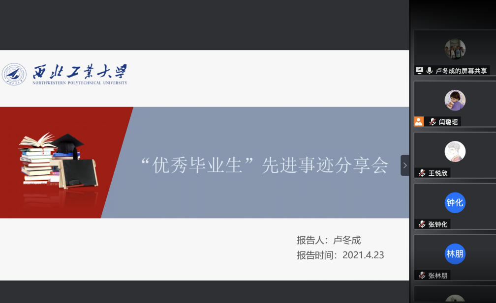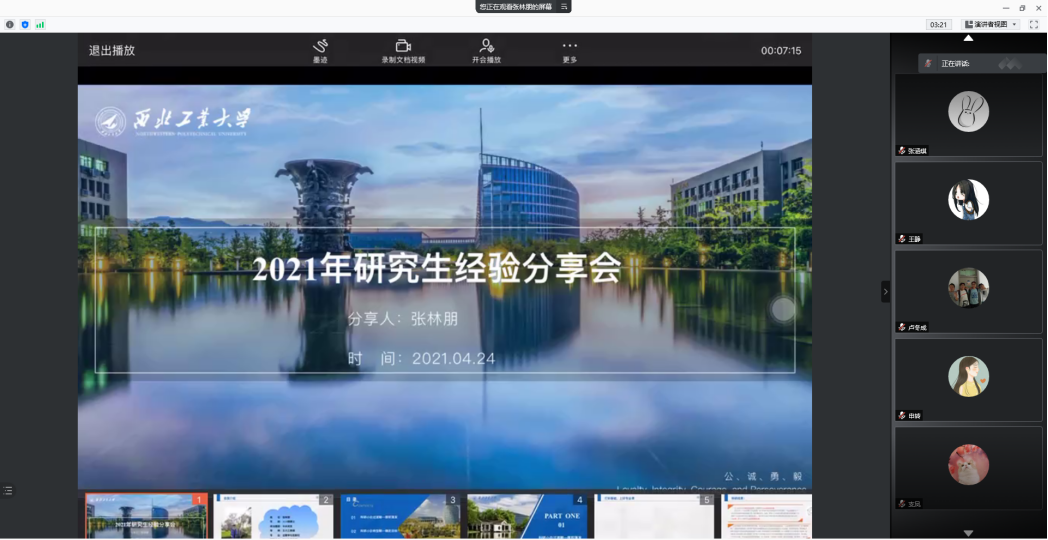 2021年4月23日, *成人片 举行了2021届研究生优秀毕业生线上分享会,2021届优秀毕业生闫璐瑶、张林朋和卢冬成三位毕业生围绕他们在校期间的生活、科研、工作等方面,为学弟学妹们分享经验。