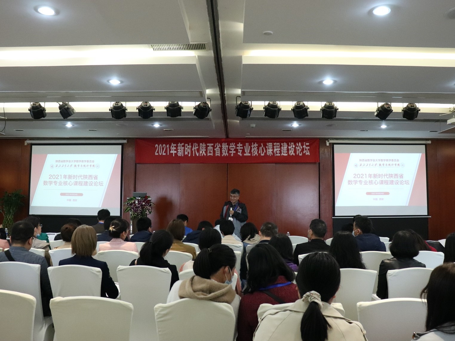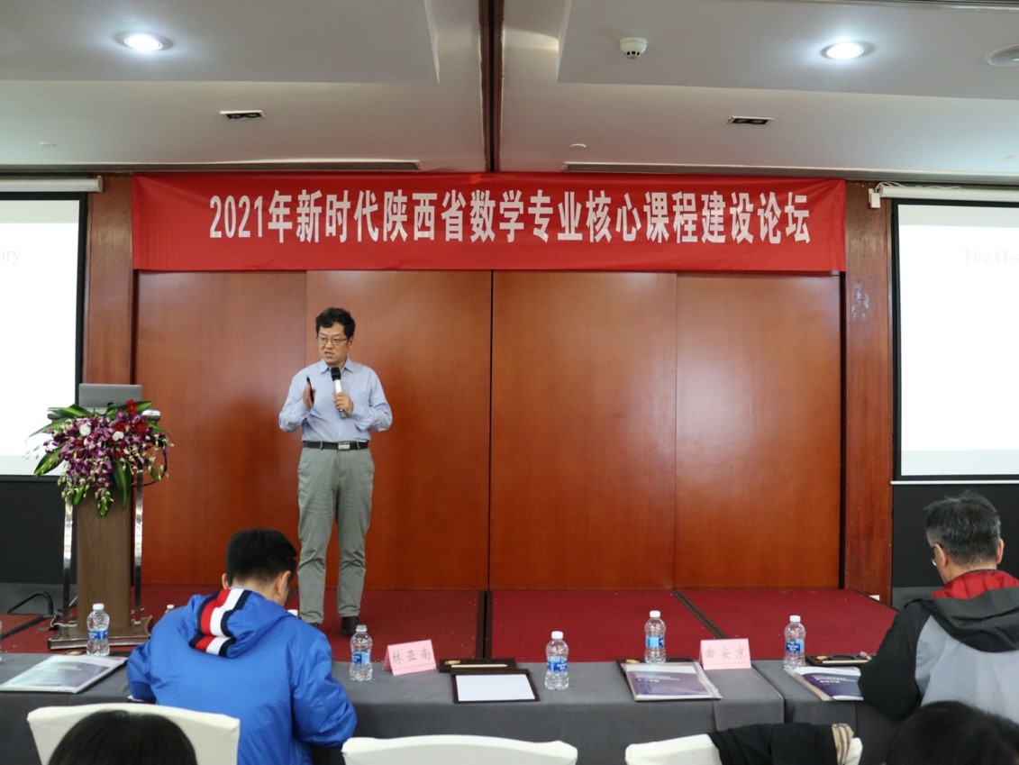 由陕西省大学数学教学委员会主办,成人片 承办的新时代陕西省数学专业核心课程建设论坛,于2021年4月24日下午在西安市高新区志诚丽柏酒店20楼多功能厅召开。本次论坛旨在加强陕西地区数学专业核心课程建设、促进陕西高等院校数学核心课程教师之间的交流。会议邀请了厦门大学林亚南教授、中国科技大学赵卿教授、西北大学曲安京教授进行报告。来自西安、宝鸡、杨凌、兰州、银川等地的26所高校130余位高校数学课程负责人及教师参加了本次论坛。