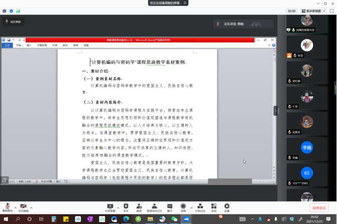 为进一步推进微积分课程的课程思政建设,提高任课教师对课程思政的理解和运用能力,进一步提升公共基础课程的育人实效,12月23号微积分课程教学团队举行了本学年团队的第四次全体会议,暨微积分课程思政素材案例分享交流会。本次会议共有23位教师在线参加,其中8位教师进行了课程思政教学经验和案例分享,会议由课程负责人张莹主持。