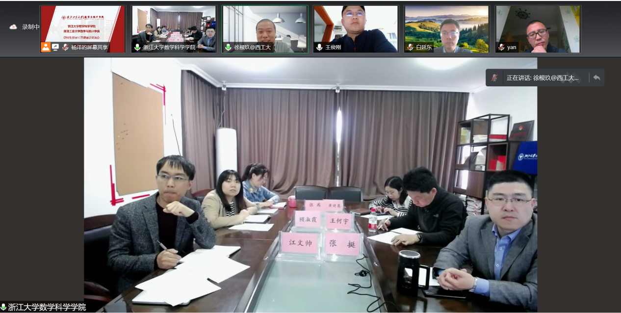 4月19日下午, *成人片 与浙江大学数学科学学院通过腾讯会议组织数学公共课建设与研究生培养工作线上交流会,调研学习浙江大学研究生数学公共课支撑一流人才培养、一流学科建设方面的改革方案和创新举措。浙江大学数学科学学院副院长江文帅、副院长张挺、院长助理王何宇、学院教学科负责人、公共数学基础课程教学研究中心负责人、研究生秘书参会交流,成人片 院长助理王俊刚、基础与前沿课程中心负责人、各系研究生培养负责人、研究生秘书参加调研,会议由副院长徐根玖主持。