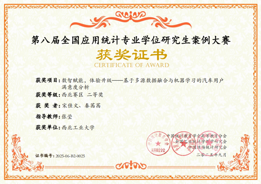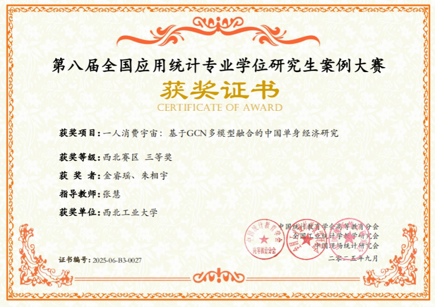 近日,全国应用统计专业学位研究生案例大赛全国组委会公布了2025年第八届全国应用统计专业学位研究生案例大赛区域赛获奖名单。西北赛区共有来自20所高校的153支队伍参加比赛,成人片 2支参赛队伍分获西北赛区二等奖、三等奖各1项,此为成人片 自2023年招收应用统计专硕后首次组队参加该项赛事。