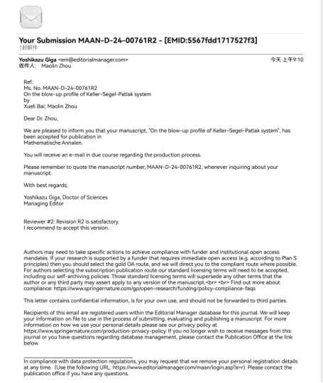 近日, *成人片 分析与几何研究团队青年教师白学利教授与南开大学周茂林教授合作,在Keller-Segel-Patlak模型的解的爆破形状精确刻画方面取得突破,研究结果“On the blow-up profile of Keller-Segel-Patlak system”被数学综合期刊Mathematische Annalen接收,这是成人片 继姚磊教授之后再次在该著名数学综合期刊发文。