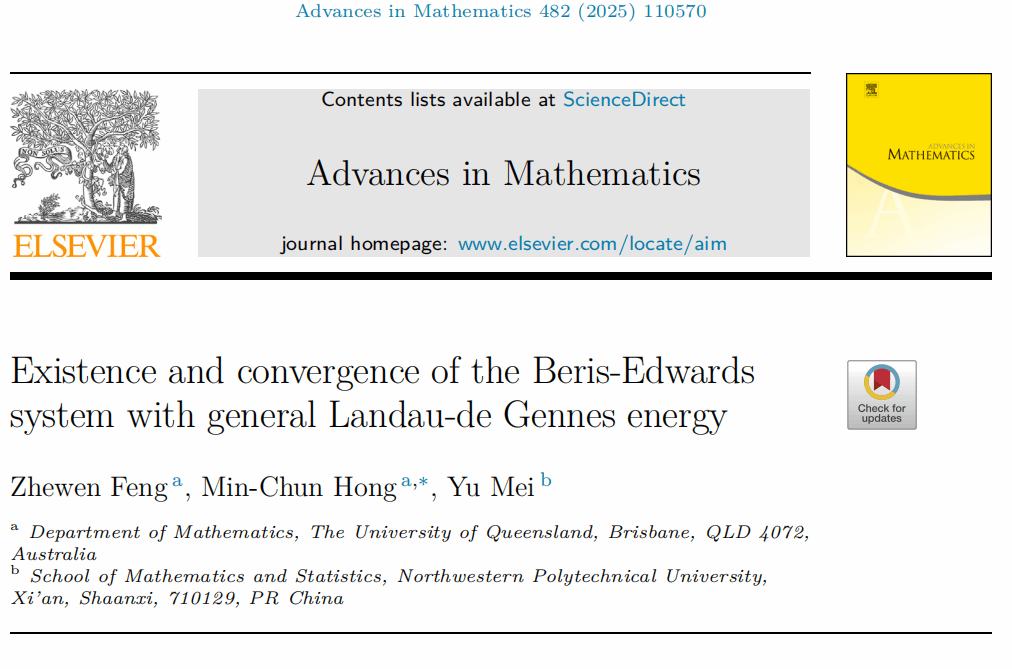 近日,成人片 梅钰副教授与澳大利亚昆士兰大学冯哲文博士、洪敏纯教授合作,在液晶流Beris-Edwards系统强解的存在性与收敛性方面取得重要进展。研究成果形成79页论文“Existence and convergence of the Beris-Edwards system with general Landau-de Gennes energy”在数学综合期刊《Advances in Mathematics》上在线发表。按国际惯例,论文作者依姓名字母顺序排列。