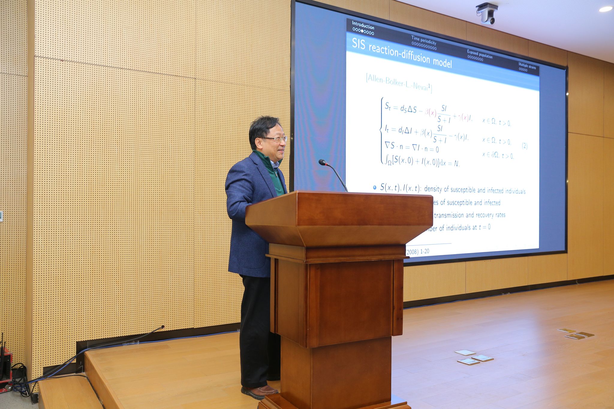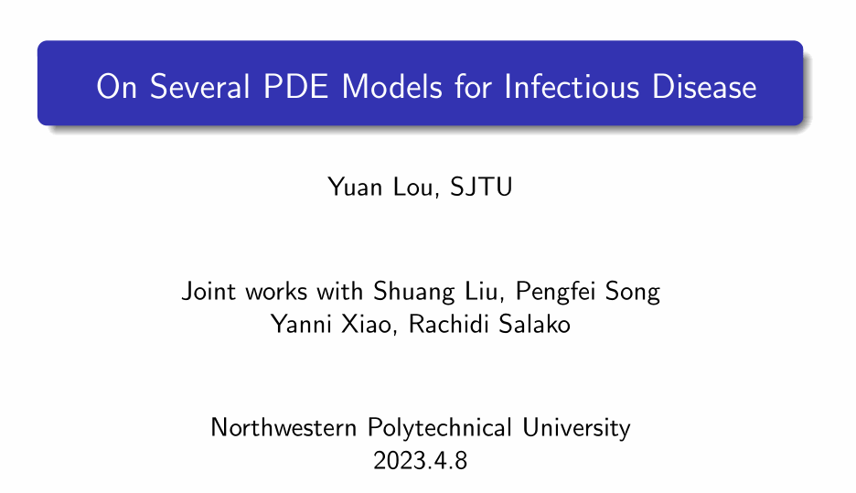 第二场报告前,聂玉峰院长介绍了楼教授的简历。他曾在MSRI和芝加哥大学做博士后,任教于俄亥俄州立大学数学系,并曾担任美国数学生物研究所副所长。研究兴趣为反应扩散方程及应用,发表相关学术论文140余篇。目前担任CSIAM-AM,J.Differential Equations,J.Math.Biol.,SIAM J.Appl.Math.等期刊编委以及DCDS-B系列的共同主编。