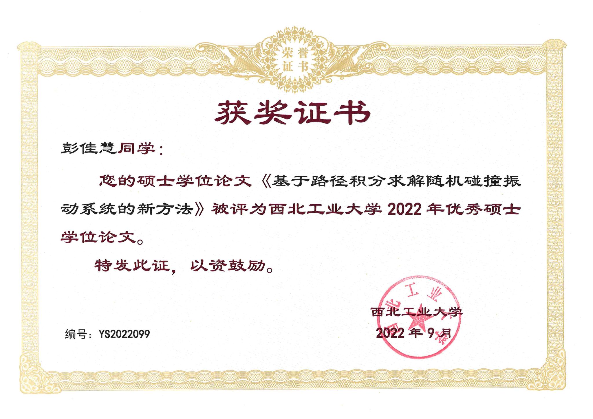 彭佳慧,女,概率论与数理统计专业,师从王亮教授,研究方向为随机碰撞振动系统的路径积分算法研究。硕士在读期间,以第一作者分别在国际著名期刊Nonlinear Dynamics和Chaos发表论文2篇,另协作发表高质量论文3篇。作为核心参与人参与军科委基础研究计划和国家自然科学基金等项目。荣获研究生国家奖学金、成人片 优秀研究生标兵、成人片 优秀毕业生以及陕西省优秀毕业生等多项荣誉。