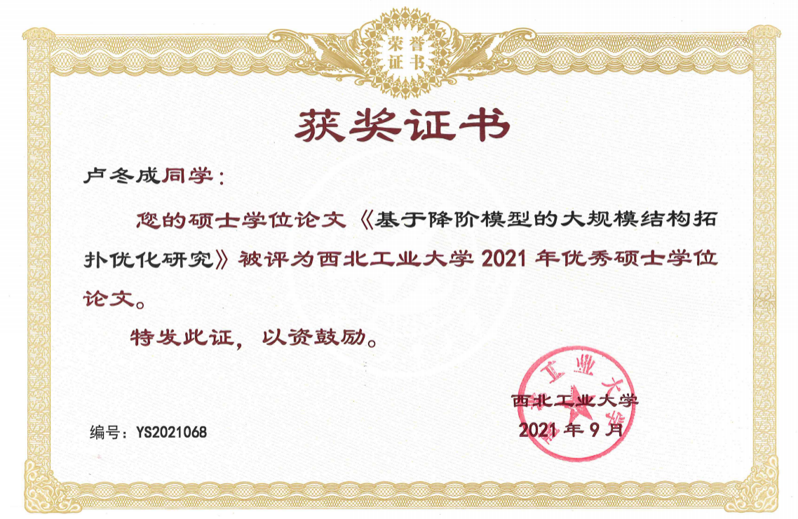 个人简介:卢冬成,男,计算数学专业,师从肖曼玉副教授,研究方向为基于缩减模型的大规模结构拓扑优化,致力于解决拓扑优化设计自由度大、效率低的重难点问题。硕士学习期间,参与国家自然科学基金、中央高校基金、省基金等多个项目,主持并完成成人片 研究生创意创新种子基金项目1项,积极参与多项重大基金和项目以及国内外学术会议,共发表3篇高水平学术论文,为大规模拓扑优化的学术研究和工程应用提供了一定参考价值。荣获硕士研究生国家奖学金等多个奖项,并荣获2021年优秀毕业生称号。