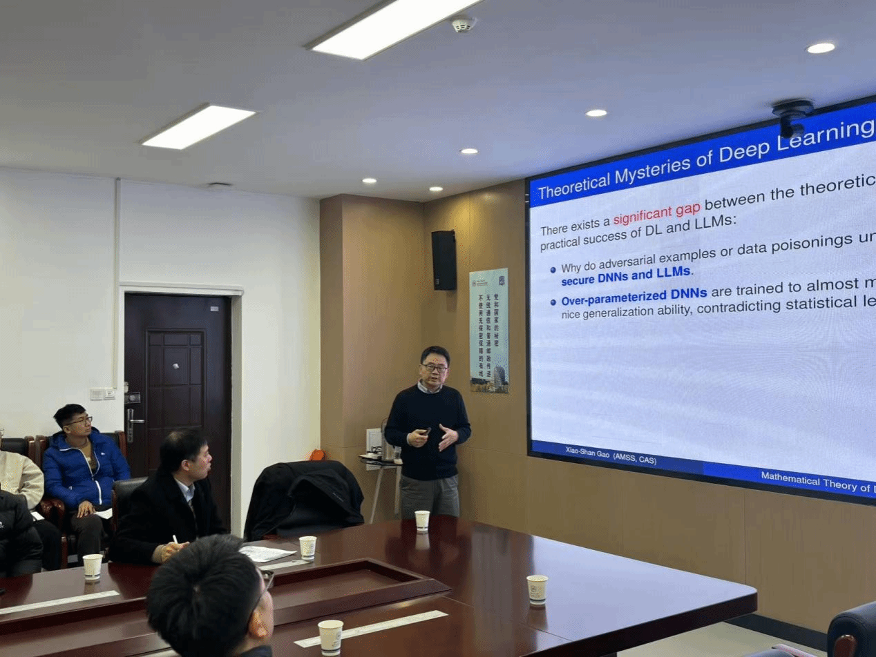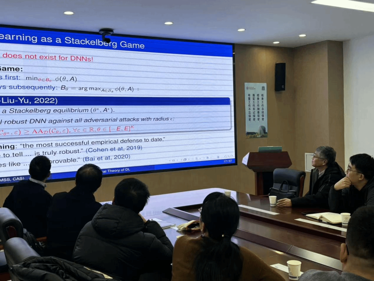 高小山以《Mathematical Theory of Deep Learning: Security and Generalization》为题,介绍了深度学习泛化与安全数学理论近期的若干进展。随后,高小山从防御者的角度出发,介绍了过参数插值深度网络的泛化性与对抗鲁棒性,并通过Stackelberg博弈给出具有最优对抗鲁邦性的深度网络。同时,他还介绍了如何通过Wasserstein分布鲁邦优化(WDRO)得到同时具有安全性与泛化性的深度网络与大模型。