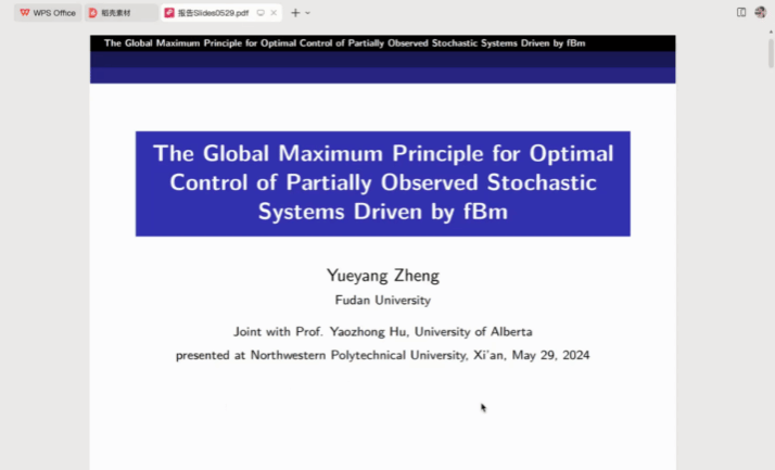2024年5月29日, *成人片 第7期“九章学术沙龙”成功举办。此次沙龙邀请了复旦大学郑越洋博士后作了题为“The Global Maximum Principle for Optimal Control of Partially observed Stochastic Systems Driven by Fractional Brownian motion”的学术报告。30余位师生参会,本次报告由裴斌教授主持。