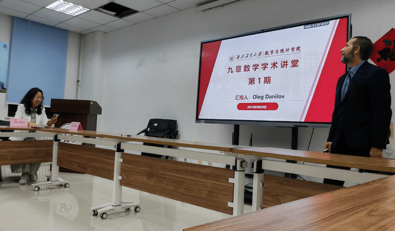 为深入贯彻落实《成人片 科技工作高质量发展行动计划》,切实活跃学院科研交流氛围,提升有组织科研能级, *成人片 开展“九章数学系列学术报告”活动。2023年9月28日,第一期“九章数学学术讲堂”在启翔楼357进行,讲堂邀请俄罗斯新西伯利亚国立大学Oleg Danilov教授主讲,成人片 党委书记王莉、院长聂玉峰、副院长都琳、国际交流与合作办公室主任肖曼玉等20余位教师和学生参会,会议由肖曼玉主持。