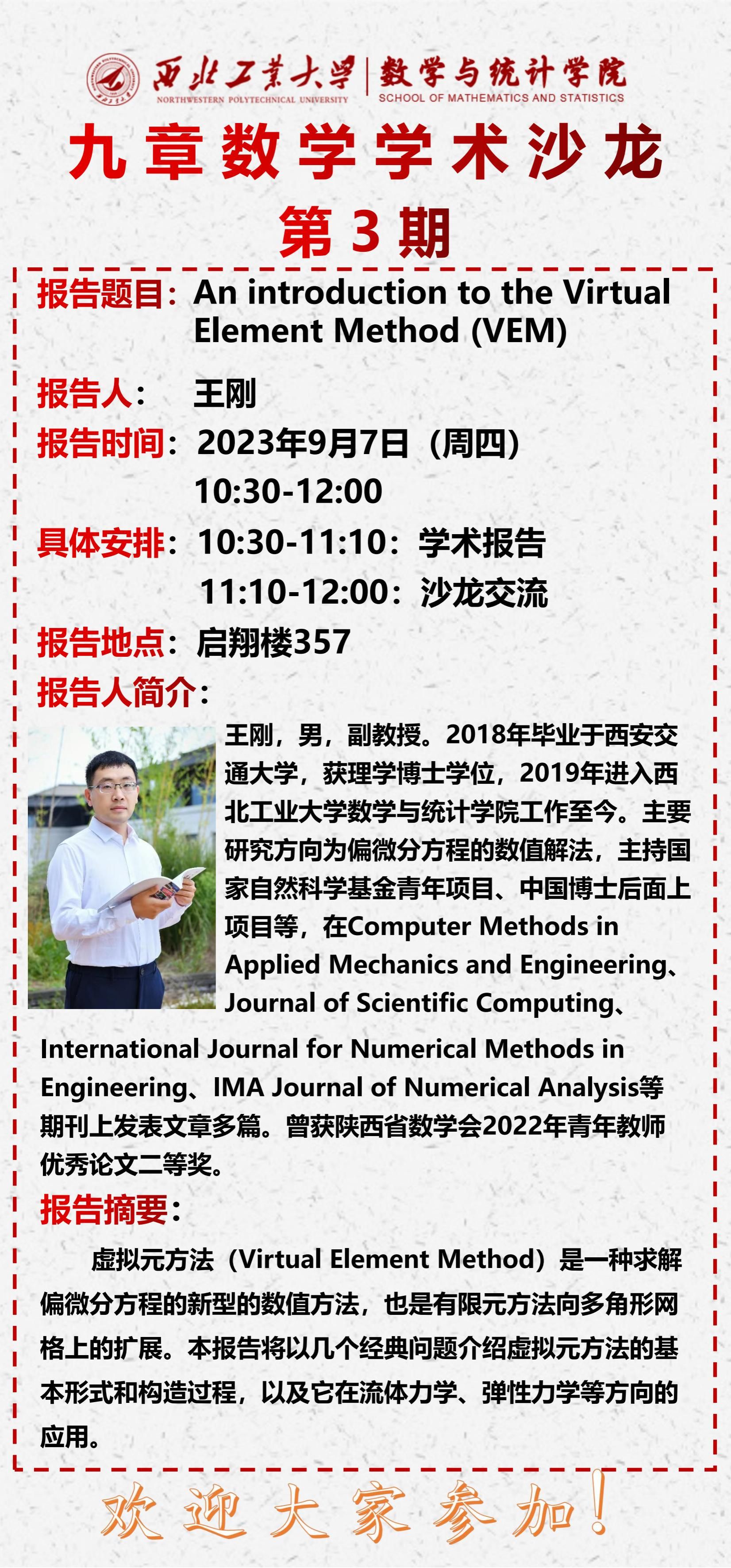 为充分贯彻落实《科技工作高质量发展行动计划》,促进成人片 师生间的相互了解,进一步营造积极活跃的学术交流氛围, *成人片 于2023年9月7日在启翔楼357举行第三期“九章数学学术沙龙”。 *成人片 王刚副教授做了题目为《An introduction to the Virtual Element Method (VEM)》的报告,都琳副院长、王晓东教授以及学院20余位教师和学生参加,会议由王晓东主持。