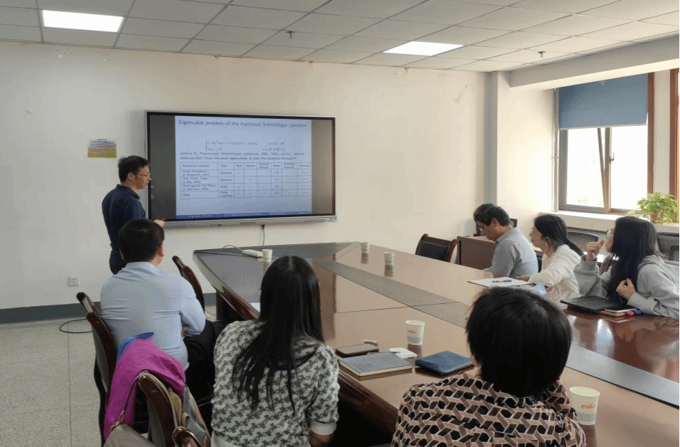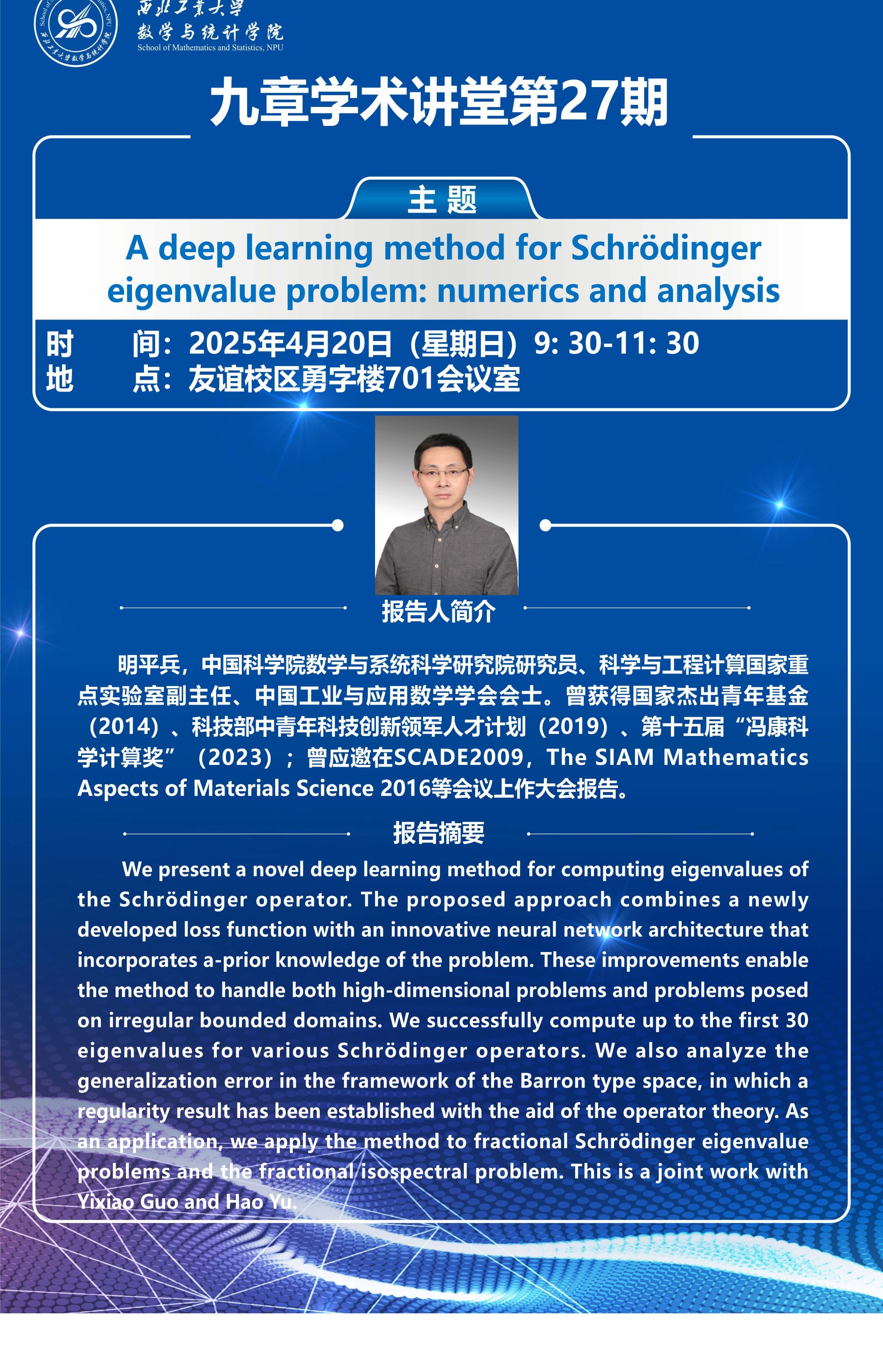 明平兵以《A deep learning method for Schrödinger eigenvalue problem: numerics and analysis》为题,介绍了一种用于计算Schrödinger 算子特征值的新型深度学习方法。所提出的方法将一种新开发的损失函数与一种创新的神经网络架构相结合,该架构同时还融入了问题的先验知识。这些改进使得该新型深度学习方法能够处理高维问题、以及不规则有界区域问题。随后,明平兵列出了用所设计的算法来计算各类Schrödinger算子的前30个特征值的数值效果,并与其他已有算法做对比,展示了其有效性。此外,报告中还详细介绍了在Barron-型空间框架下的泛化误差分析结果,以及在该框架中借助算子理论建立的相关正则性结果。作为应用,该方法可应用于分数阶薛定谔特征值问题和分数阶等谱问题等。