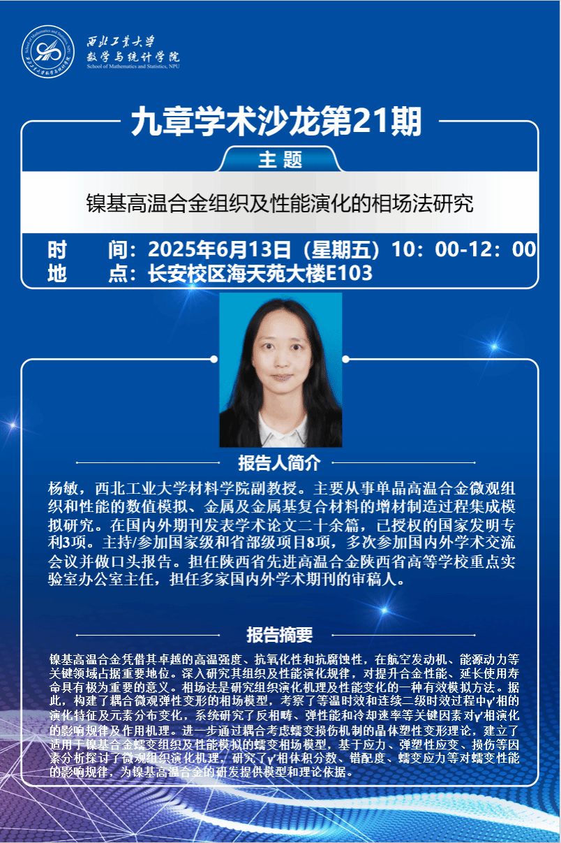 2025年6月13日,应 *成人片 副院长都琳教授及王晓东教授邀请,材料学院杨敏副教授在海天苑大楼E103会议室作了题为《镍基高温合金组织及性能演化的相场法研究》的学术报告。学院近20位师生参会共探学术前沿,报告由都琳主持。