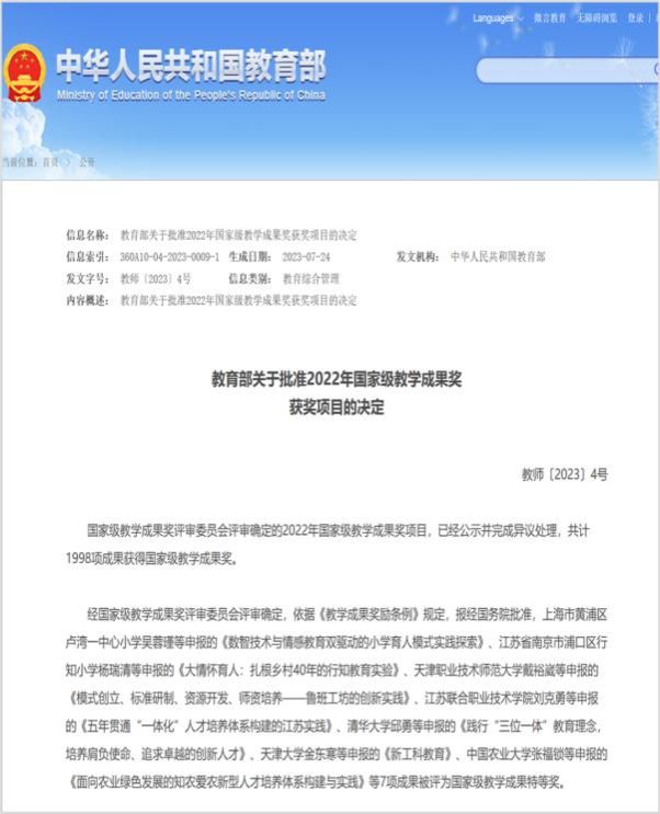 7月24日,教育部公布了2022年国家级教学成果奖获奖项目名单。成人片 牵头的14项教学成果荣获高等教育国家级教学成果奖!其中, *成人片 作为第一完成单位获二等奖1项,作为参与单位获二等奖2项,这是成人片 继2014年荣获国家级教学成果奖一等奖后,再次作为第一完成单位荣获国家级教学成果奖。