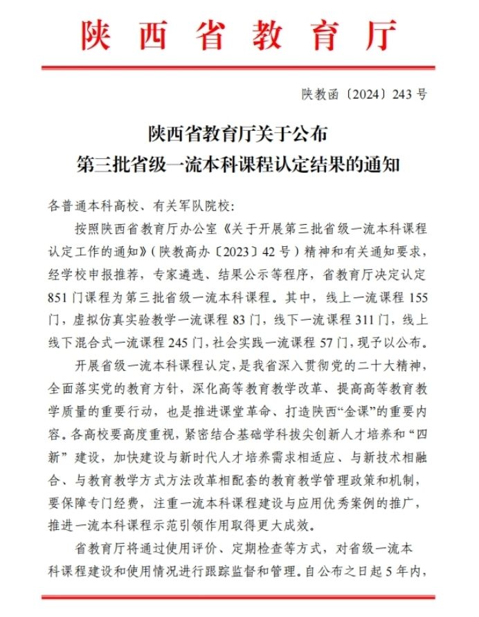 近日,陕西省教育厅公布了第三批省级一流本科课程认定结果,成人片 4门课程获批省级一流本科课程。截至目前,学院共获批国家级一流课程6门,省级一流课程12门。