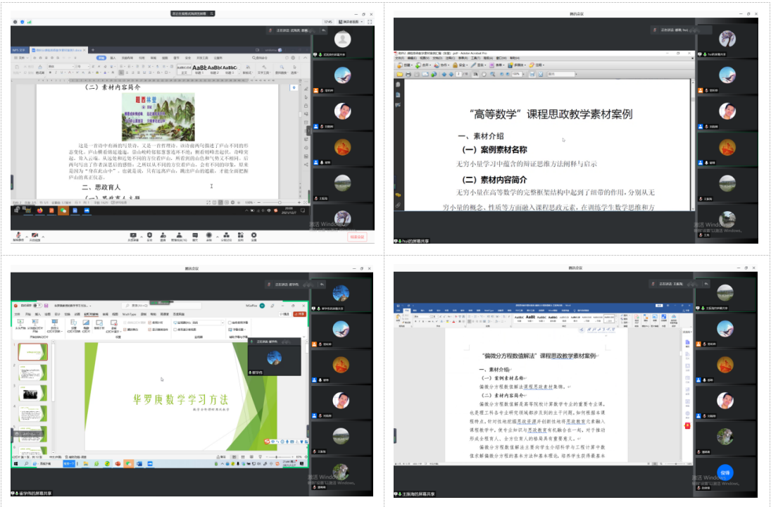 之后各位老师分别进行了公共课和专业课程的案例分享,并对每个素材案例如何设计进行了详细的介绍。会议中各位老师分享的课程思政素材经过精心设计,将国际视野、家国情怀、数学文化等内容有机融入大学数学的教学过程中。教学案例实施的环节按照寓德于教、寓道于教、寓教于乐的思路,通过专题嵌入、元素化合、隐性渗透的方式,将课程思政有效融入课前导入、课中和课后教学全过程。