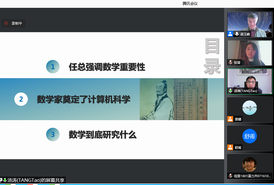 报告会环节,汤涛院士首先介绍了香农、冯诺依曼、阿兰图灵,以及中国的刘徽、冯康等计算领域的数学家,并从信息科技、科学计算以及金融数学的发展等方面讲述现代数学的魅力和影响。从华为创始人任正非强调数学的重要性谈起,向同学们科普了数学研究的对象,并介绍了华为如何借鉴法国、俄罗斯等国的数学研究推动信息通信的发展。汤涛院士表示谁占领数学最高地,谁就能占领技术的最高地,在加强基础数学研究的同时,大家应面对国家需求大力开展应用数学、计算数学、金融数学和概率统计的研究,为提升国家科技实力作出贡献。