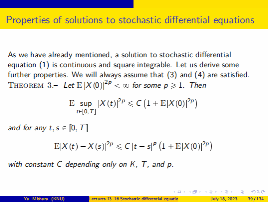 Yuliya Mishura教授首先回顾和重新定义《概率论》中的一些基本概念。包括概率空间、随机过程的定义和基本性质及其数学特征,条件期望的严格定义,以及鞅的概念与基本性质。Yuliya Mishura教授接下来介绍了此次本课程的一个重要概念布朗运动,以及布朗运动的性质、联合分布、首次命中时间和最大值的分布等内容,并由此引出随机积分和伊藤公式,通过应用伊藤公式求解随机微分方程,推导随机微分方程解的存在唯一性定理,及其强弱解的一致有界性等性质。