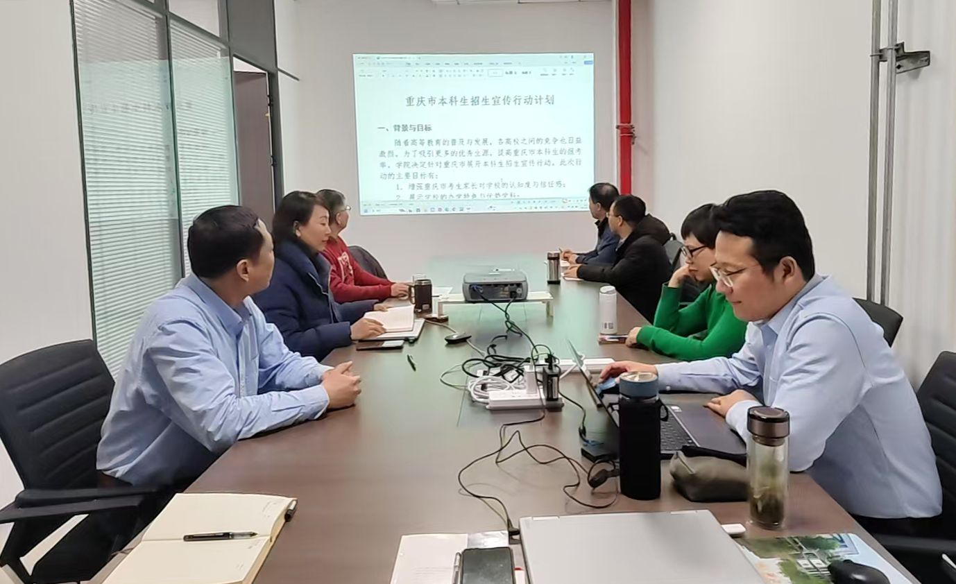 2025年3月5日下午, *成人片 在长安校区海天苑大楼E202召开2025年重庆市本科招生宣传工作会议。学院院长聂玉峰、党委书记王莉、副院长徐根玖、副院长郭千桥、院长助理刘晓刚、重庆招生组组长林伟、西安招生组组长王振海、招生秘书李彦吉参加会议。会议由郭千桥副院长主持。