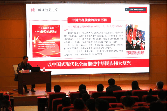 11月8日, *成人片 联合电子信息学院共同举办学习贯彻党的二十大精神专题党课,特邀陕西师范大学远程教育学院书记刘建军作了题为《以中国式现代化全面推进中华民族伟大复兴》的党课。 *成人片 和电子信息学院理论学习中心组成员、师生党员代表、青年学习理论小组成员共200余人参加会议。会议由 *成人片 党委书记王莉主持。