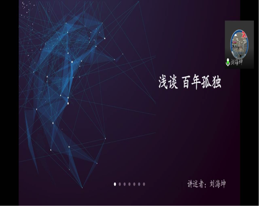 刘海坤,熊焰森同学共同为大家分享马尔克斯的《百年孤独》。《百年孤独》这本书被誉为“再现拉丁美洲历史社会图景的鸿篇巨著”,描写了布恩迪亚家族七代人的传奇故事,以及加勒比海沿岸小镇马孔多的百年兴衰。这本书时间跨度长,涉及历史区域广,且融入了神话传说、民间故事、宗教典故等神秘因素,糅合了现实与虚幻。在与大家的分享中,两位同学结合自己的阅读历程将自己的感受娓娓道来。