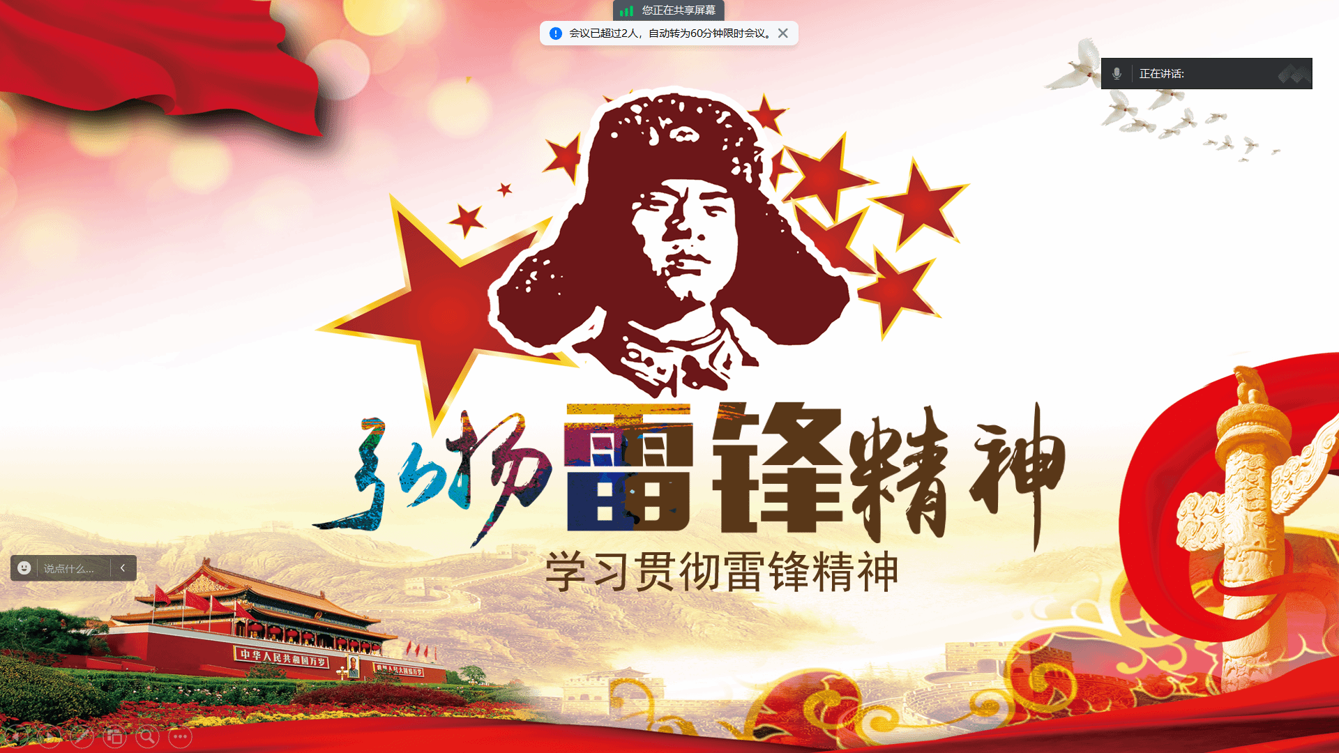 让我们一起传承和弘扬雷锋精神,身体力行,服务他人,在学习中争做时代先锋,为建设社会主义现代化强国和中华民族的伟大复兴而努力奋斗!