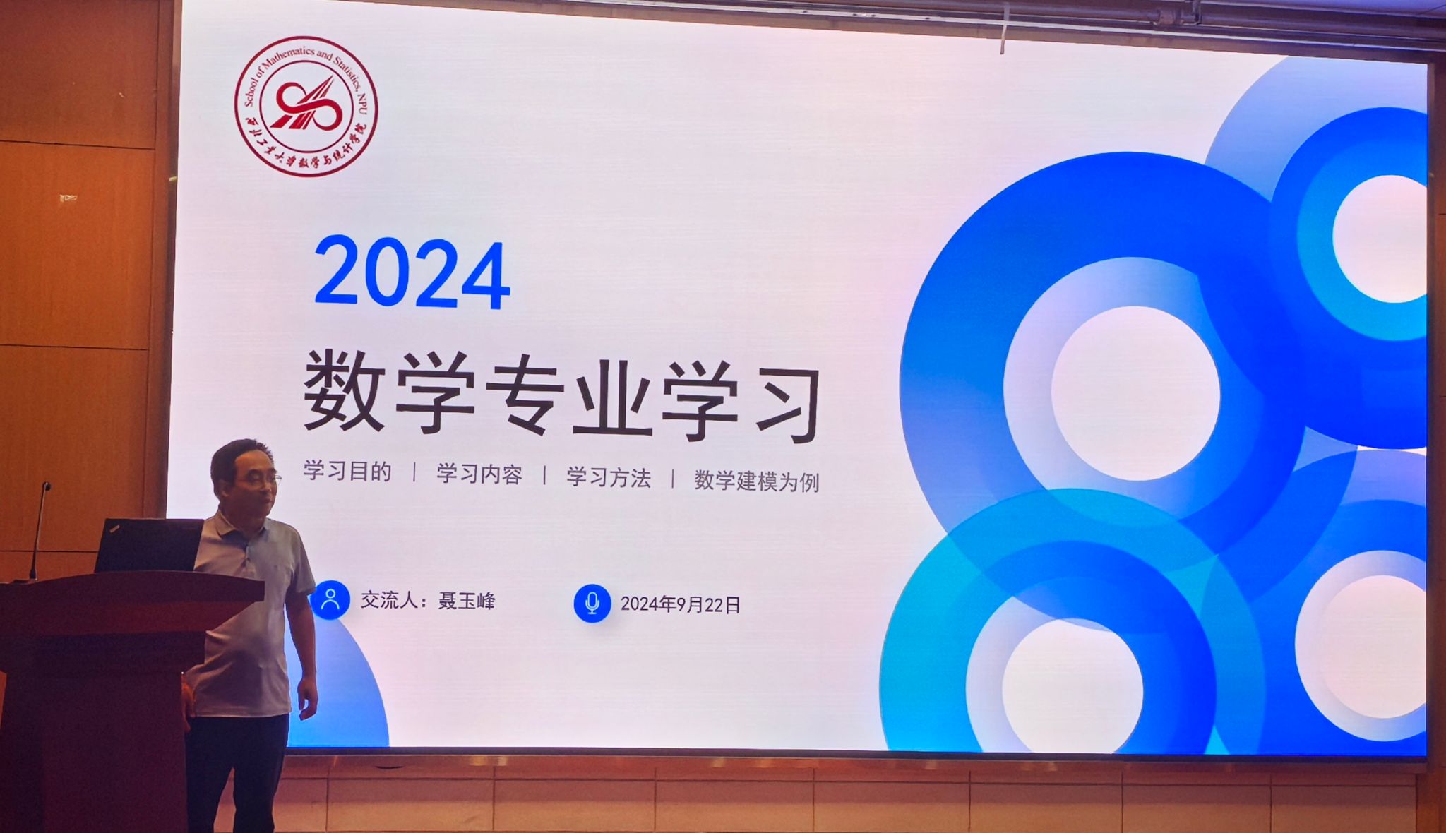 9月22日, *成人片 院长聂玉峰为2024级149名本科新生讲授了关于数学专业学习的主题思政课,引领大家进一步深刻体会学院“坚持‘科学问题导向,应用问题驱动’,践行‘数学+’、‘+数学’的创新人才培养模式”以及未来建成人才培养与科学研究并重、应用特色鲜明的国内一流 *成人片 的远大目标。学院数学科学系主任陆由、计算科学系主任赵俊锋、应用概率统计系主任王亮、院长助理兼2024级本科生辅导员班凯共同聆听了这生动的一课。报告会由副院长郭千桥主持。