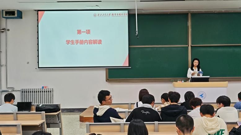 张倩以《学生手册》为依据,采取“条款+案例”相结合的方式逐项解读重点内容。她围绕请销假制度、课堂纪律、奖惩细则与日常行为规范等关键模块,引导新生牢固树立规则意识,严格遵守校纪校规,号召大家共同营造和谐稳定的校园环境与良好学风。