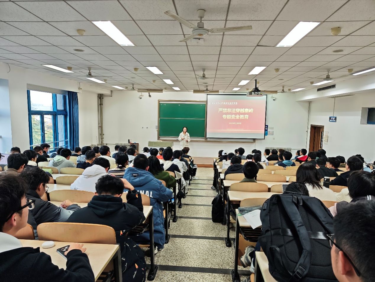 随后,会议聚焦“严禁违法穿越”安全主题教育。张倩老师结合近期各地发生的违法穿越未开发区域、野外探险遇险等案例,详细讲解了违法穿越的法律后果与安全风险,着重强调了遵守法律法规、敬畏自然生命的重要性。她要求同学们坚决杜绝各类危险探险行为,提高安全防范意识,自觉守护自身生命安全与财产安全。