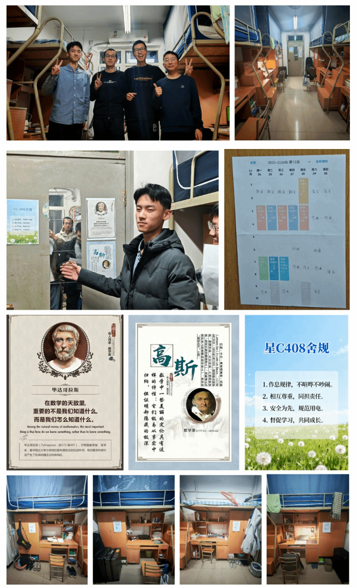 宿舍简介:我们以“逻辑化平衡”为核心理念,借日程表统筹学业生活,与舍友同频奋进;以平等沟通消弭分歧,共守舍规以保作息与安全。学业上主动问辨,相处间严谨探讨与日常谈笑兼具,尽显数学学子自律向上、温情共融的风貌。