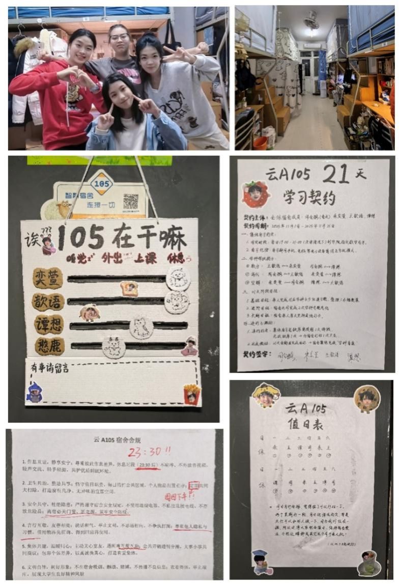 宿舍简介:云A105是满溢温情与朝气的青春家园!我们默契分工、定期清扫,让整洁成为日常底色;学习路上互帮互助,难题共研、进步共享,尽显团结奋进的模样。清晰舍规守护舒适安全,21天学习契约凝聚前行力量,创意状态提示牌暗藏贴心,让彼此的需求被温柔体谅。这里有欢笑相伴、有成长同行,是我们携手奔赴理想的暖心驿站~