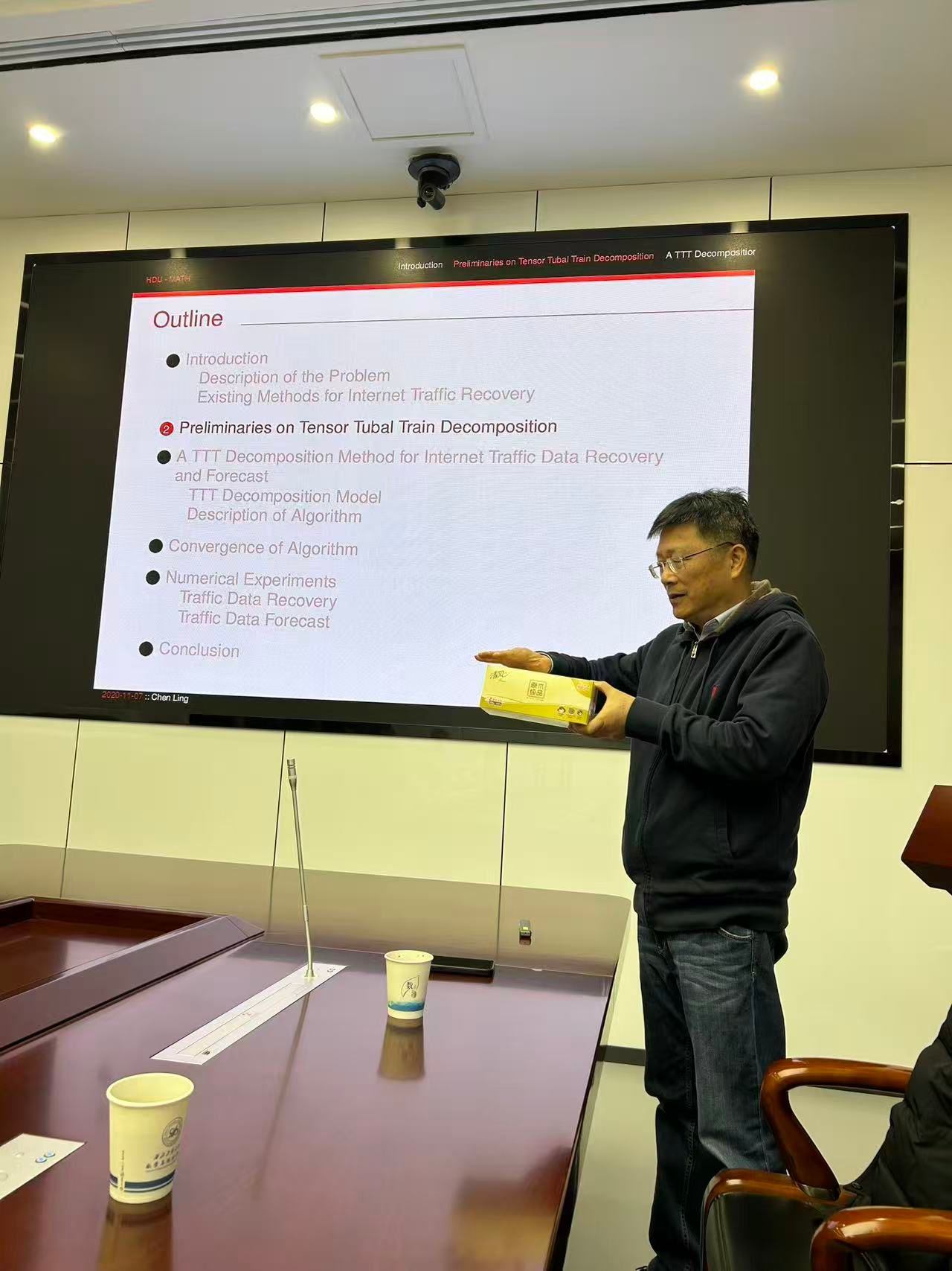 报告伊始,凌晨教授介绍了数据恢复中的结构性缺失问题。长期以来,该领域主要依赖矩阵分解方法和张量分解方法。然而,这些传统方法在处理高缺失率数据或应对结构性缺失场景时,难以捕捉互联网流量的时空关联性与周期性特征,导致数据恢复的精度不足,计算效率难以满足实际需求。基于这一背景,凌晨教授深入阐述了变换管状张量分解技术在互联网流量数据处理中的创新应用。他通过构建融合时空约束的优化模型,设计了求解的交替最小化算法,并验证了该方法在随机缺失、结构性缺失数据恢复以及多场景流量预测中的优势。