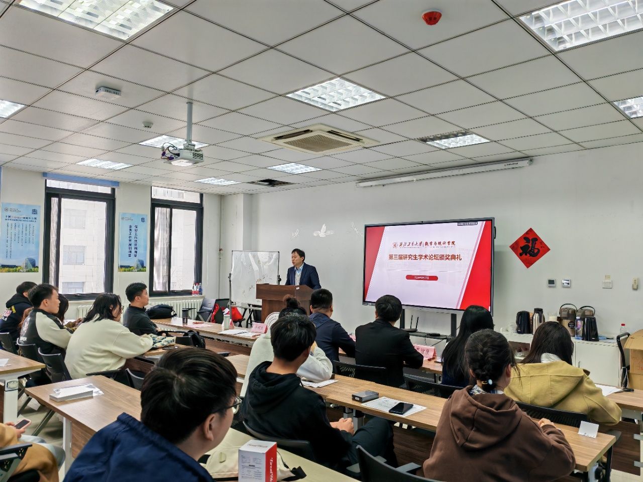 为进一步促进数学学科“双一流”建设,深入贯彻落实学校《一流研究生人才培养行动计划》,鼓励研究生展示创新成果,2024年3月27日, *成人片 在启翔楼357会议室举办第三届研究生学术论坛颁奖典礼。副院长徐根玖,教师代表王俊刚、夏健康,辅导员冀腾宇,研究生秘书杨洋及获奖研究生共50余人出席本次颁奖典礼。典礼由王俊刚主持。