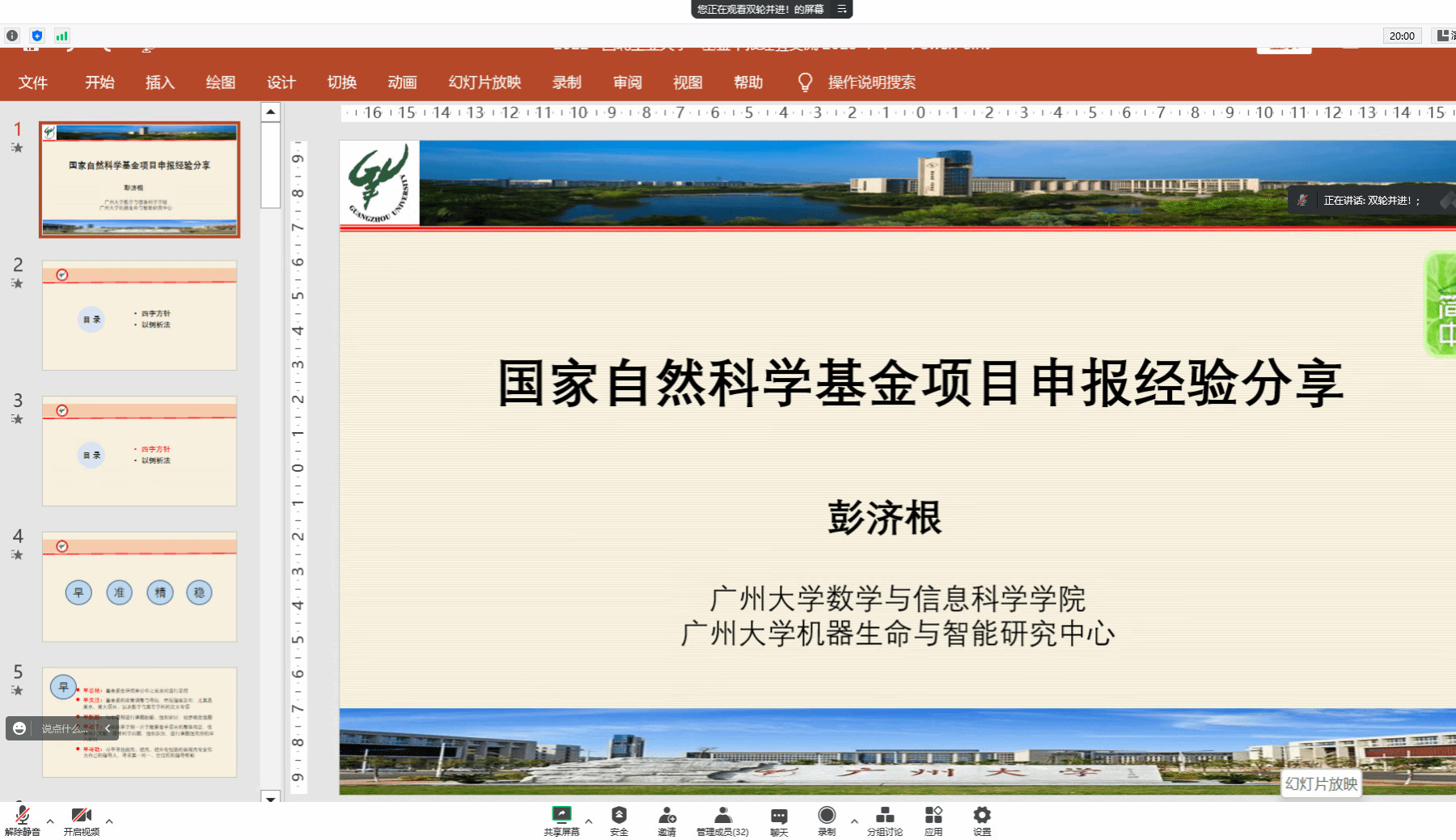 第一期动员会中,彭济根以“国家自然科学基金项目申请经验分享”为主题,从四字方针和以例析法两个方面详细介绍了在基金申请中需要注意的问题。他强调,申请国家自然科学基金项目需要尽早谋划,潜心钻研高质量成果,准确掌握申报信息并精心凝练选题。在撰写申请书的过程中,从课题名称、中英文摘要、科学问题属性到正文均需要细心研究,逐字逐句推敲打磨。彭济根从申请人和评审专家两个不同的角度,通过一些正反面案例的详细介绍,使与会教师更加明晰了在撰写过程中的重点与要点。