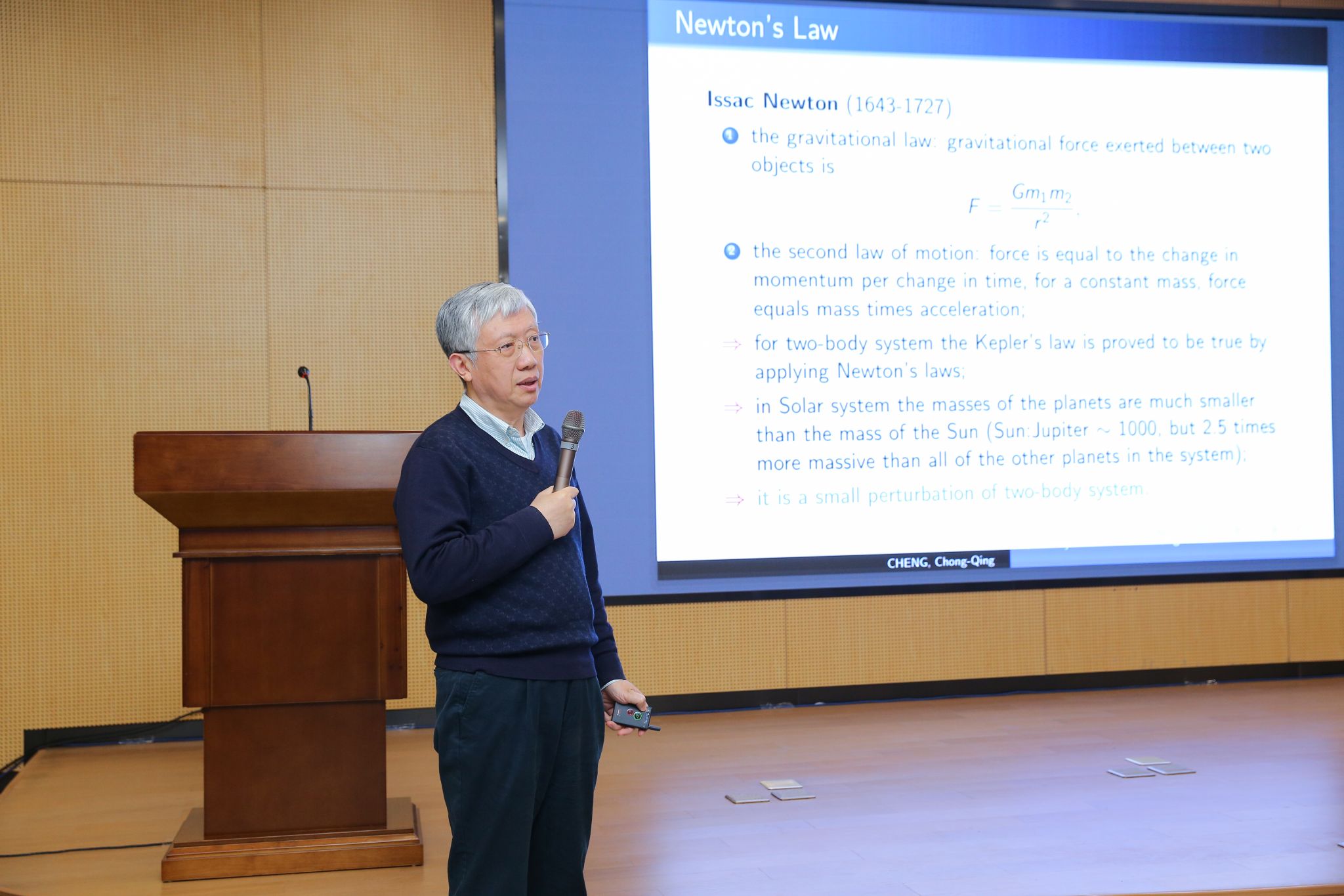 随后,程教授以《Some Dynamical Problems Originated from Celestial Mechanics》为题展开报告。他以牛顿力学为起点,阐述了由此产生的一些著名数学问题及相关研究进展,包括数学大师拉格朗日、拉普拉斯、泊松、庞加莱和物理学泰斗开普勒、牛顿、胡克等在天体力学领域的学术成就,就刘维尔定理、柯尔莫哥洛夫定理等与天体力学相关的数学理论作了讲解,用深入浅出的语言对可积系统、哈密尔顿系统、KAM理论的重大意义、Arnold扩散及最新进展等进行了介绍。