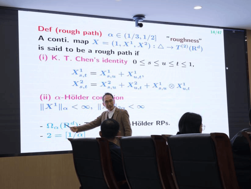 Yuzuru Inahama的报告聚焦于粗糙路径理论,对这一学科进行了深入而全面的阐述。与传统的伊藤随机微积分理论不同,粗糙路径理论摆脱了随机过程增量独立性和马氏性的理论限制,它不依赖于概率框架,而是从路径的角度为理解由“粗糙”的轨道驱动的非线性随机系统提供了强大的理论基础。Inahama在演讲中深入探讨了多个方面,包括受控常微分方程、几何粗糙路径、粗糙微分方程以及受控路径的Gubinelli理论等。本次讲堂的举办活跃了成人片 师生在粗糙路径理论方面的学术交流,更拓宽了师生的研究视野。