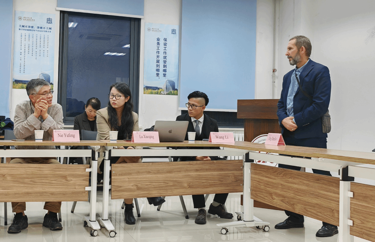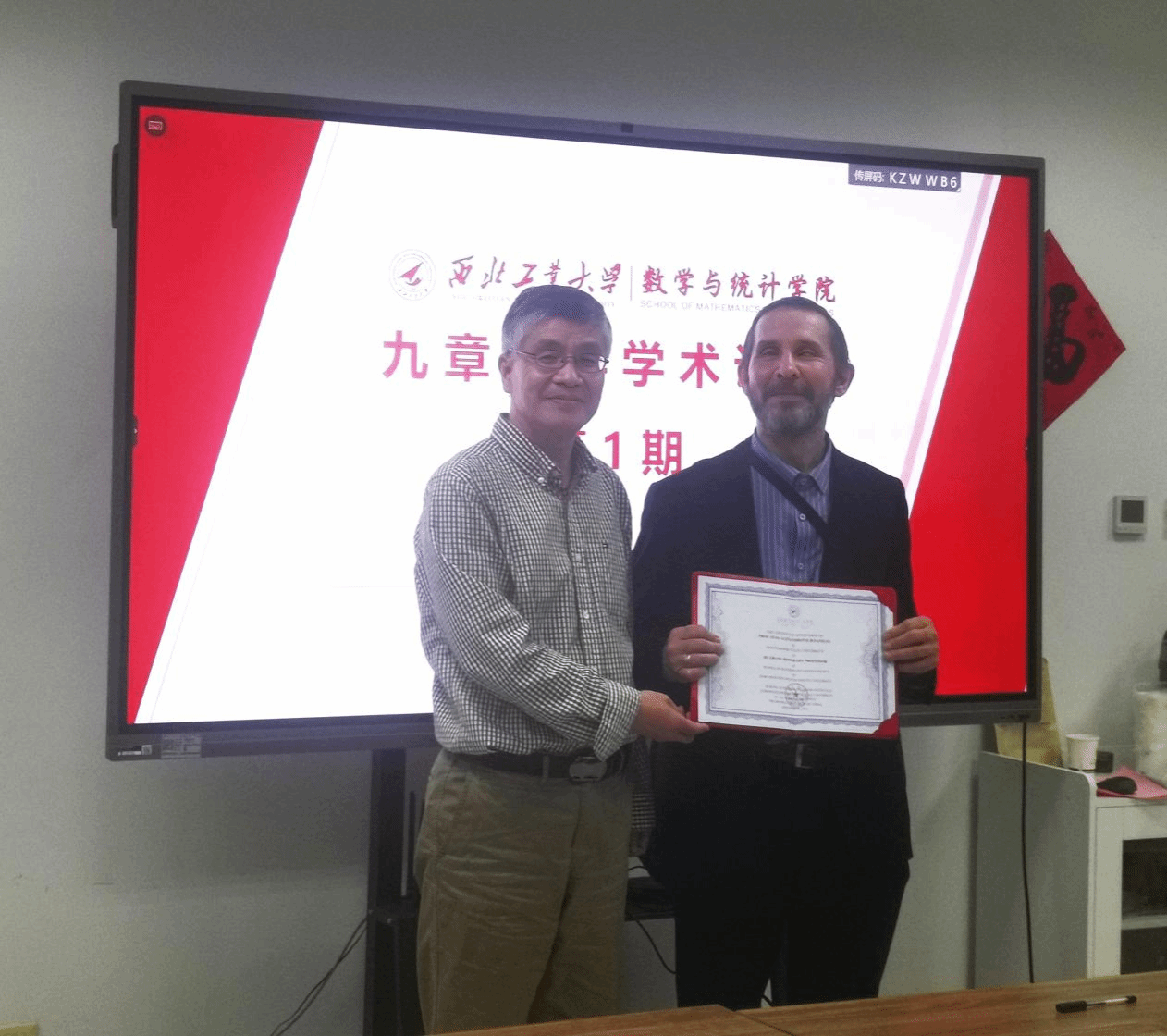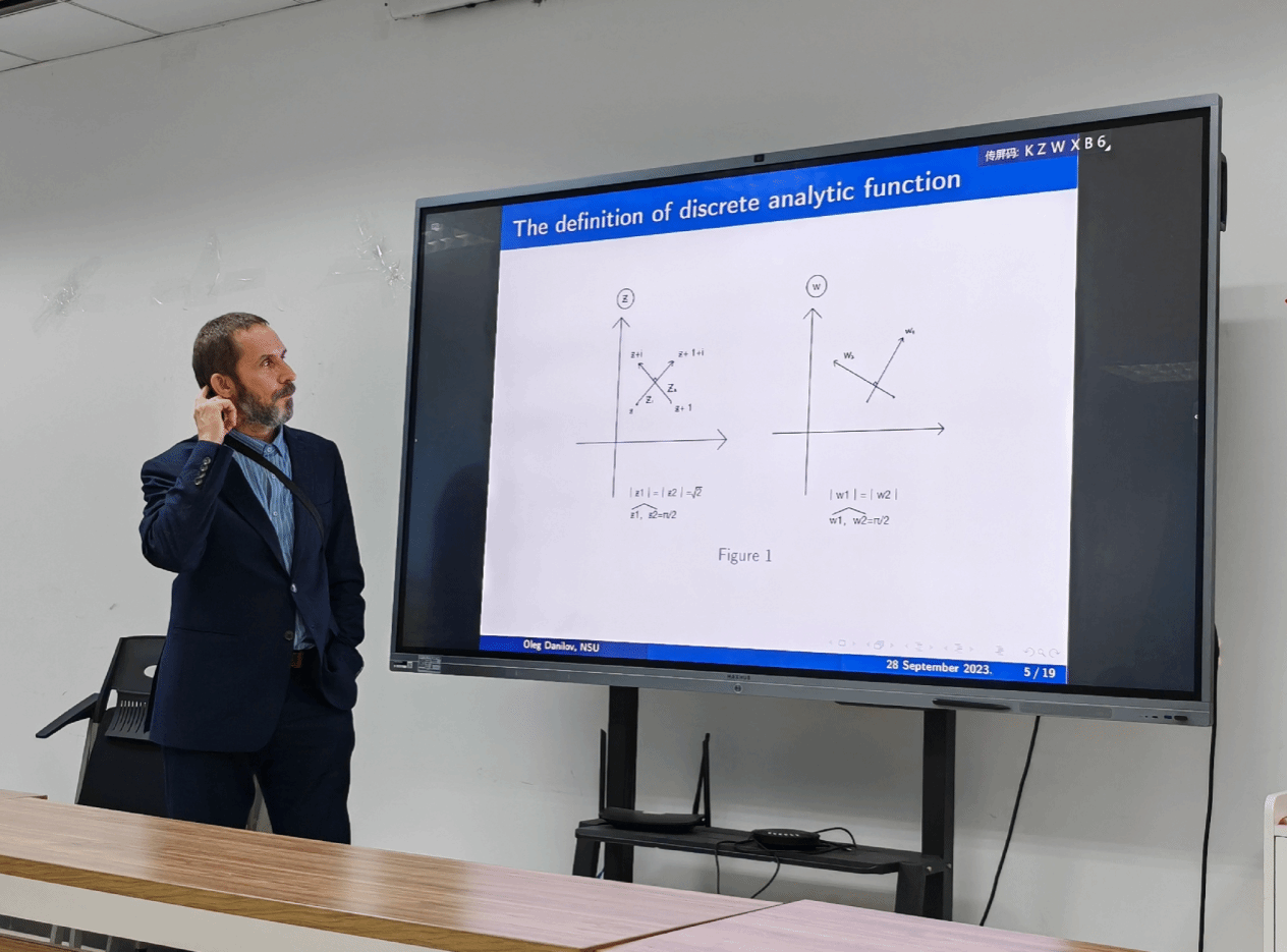 首先,肖曼玉对于Oleg Danilov进行了简要介绍,表达了对于教授来访的热烈欢迎与期盼,希望通过本次交流切实推进双方在科学研究与学生培养方面的合作。接下来,Oleg Danilov作了题目为《Discrete analytic functions in complex spaces and Taylor expansion》的报告,他围绕解析函数新的组合和分析的思想,将离散解析函数加以阐释与推广,并给出自己的新结论并加以证明。最后,参会师生与专家就感兴趣的问题进行了深入讨论与交流,聂玉峰向Oleg Danilov颁发了“九章荣誉教授证书”。