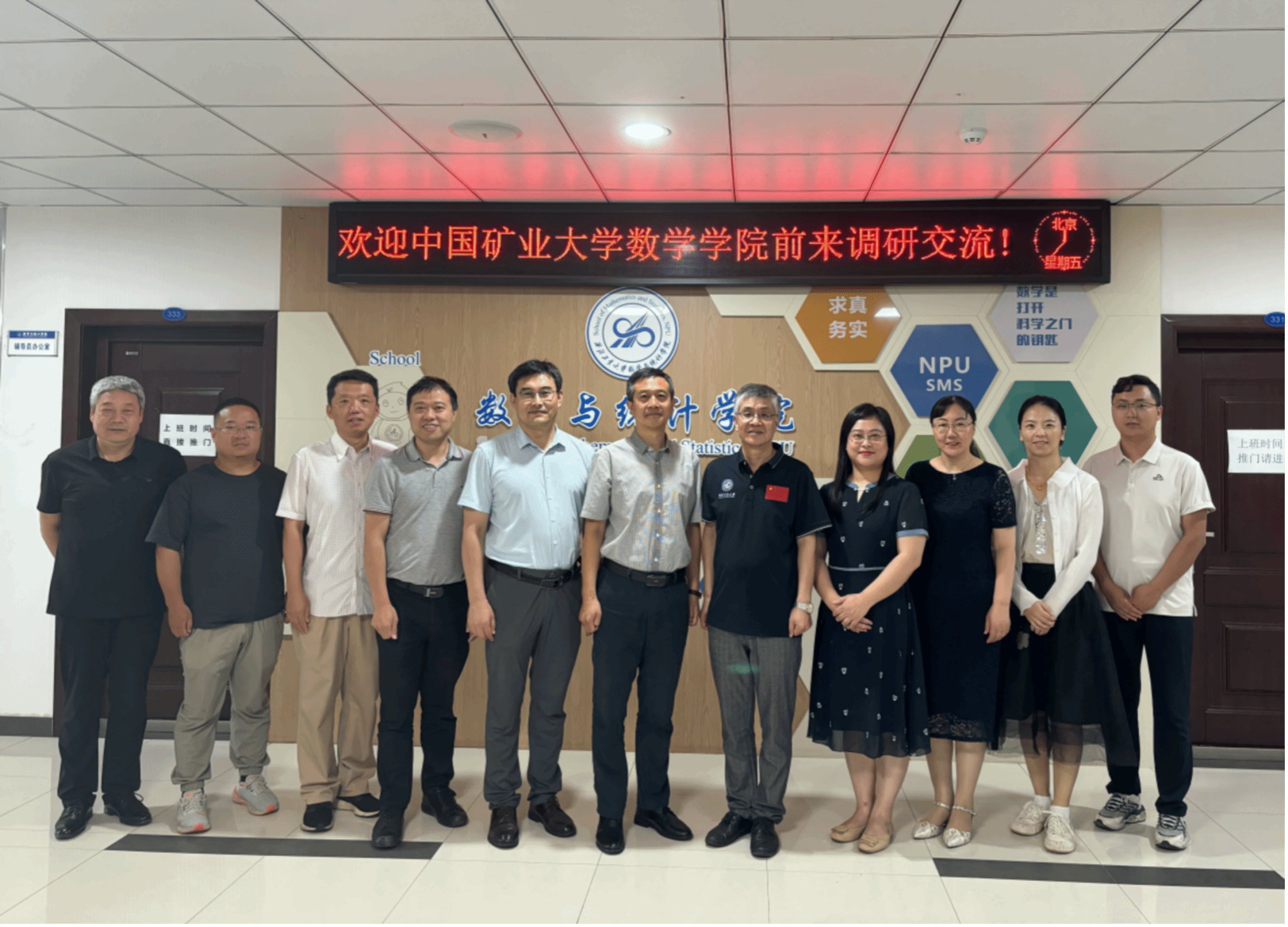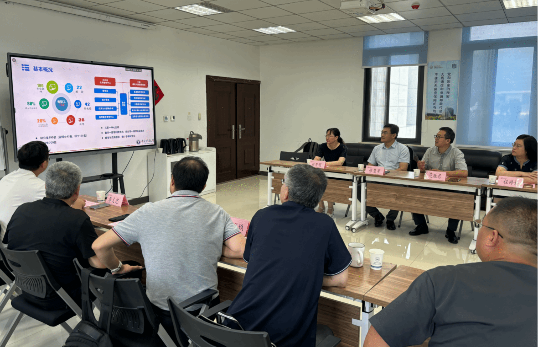 7月12日,中国矿业大学数学学院院长范胜军、副书记程婷婷,教学副院长张慧星,学科建设委员会主任邵虎,统计学专业负责人姚香娟,一行五人来成人片 调研交流,学院院长聂玉峰,副院长徐根玖、概率统计系主任王亮,实验教学中心主任佘红伟,教师李文忠及教学秘书李思遥,参加了调研座谈会。会议由聂玉峰院长主持。
