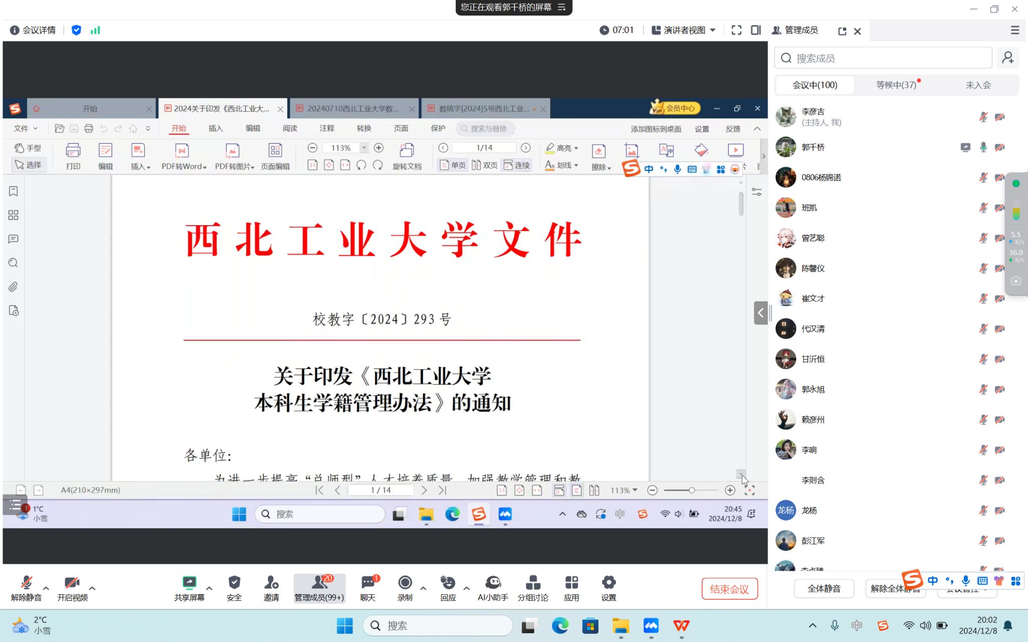 为帮助2024级新生了解成人片 学籍管理政策与相关制度, *成人片 于2024年12月8日晚20:00点召开了2024级本科生学籍管理政策线上宣贯会。学院副院长郭千桥,院长助理、学院学生工作办公室主任兼2024级辅导员班凯,班主任白建超、韩军强、彭江军、乔艳,教学秘书李彦吉和学院2024级149名新生参加了本次活动。