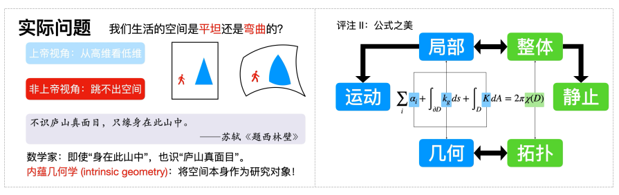 陈航参赛的内容为《微分几何》中的“Gauss-Bonnet定理的内容及简单应用”。在授课过程中,陈航介绍了毕达哥拉斯的观点和亚里士多德的论证、引导学生从不同角度欣赏公式之美,并引出著名华人数学家陈省身先生事迹,让学生体会理性思考的威力,巩固完善马克思主义哲学的世界观和方法论,培养爱国奉献等优秀品质,陶冶高尚情操,塑造健全人格。