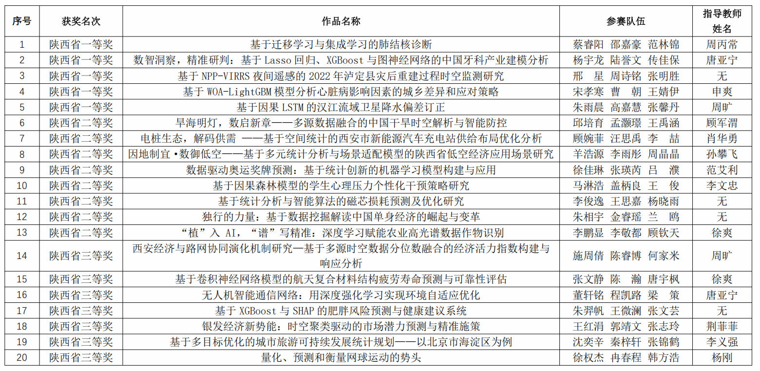 近日,全国大学生统计建模大赛陕西省组委会公布最终成绩,成人片 统计建模队伍喜获佳绩,实现多项突破。成人片 学子在本届大赛中首次有2支队伍成功入围全国赛,并以省赛一等奖5项、二等奖8项的优异成绩,在获奖数量和层次上全面超越去年,实现"质"与"量"的双跃升。