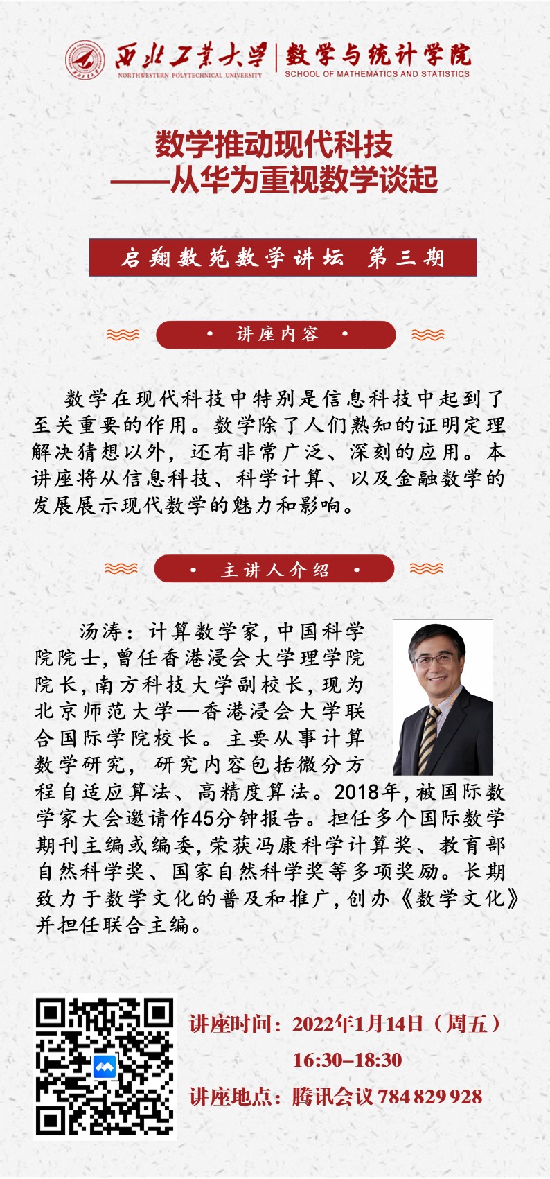 专家简介:汤涛, 计算数学家,中国科学院院士,曾任香港浸会大学理学院院长,南方科技大学副校长,现为北京师范大学—香港浸会大学联合国际学院校长。主要从事计算数学研究, 研究内容包括微分方程自适应算法、高精度算法。2018年,被国际数学家大会邀请作45分钟报告。担任多个国际数学期刊主编或编委,荣获冯康科学计算奖、教育部自然科学奖、国家自然科学奖等多项奖励。长期致力于数学文化的普及和推广,创办《数学文化》并担任联合主编。