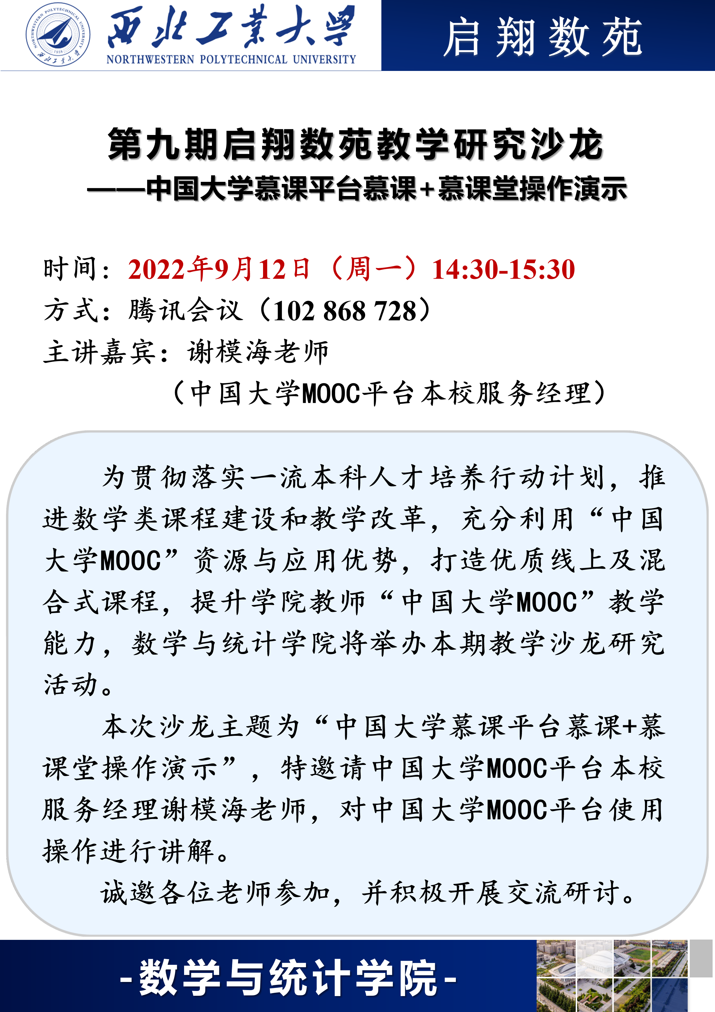 为贯彻落实一流本科人才培养行动计划,推进数学类课程建设和教学改革,充分利用“中国大学MOOC”资源与应用优势,打造优质线上及混合式课程,提升学院教师“中国大学MOOC”教学能力, *成人片 将举办本期教学沙龙研究活动。